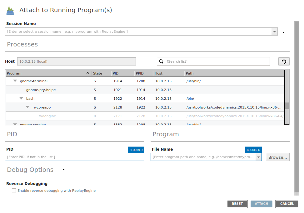 A list of processes running on the selected host displays in the Attach to Running Program(s) dialog.