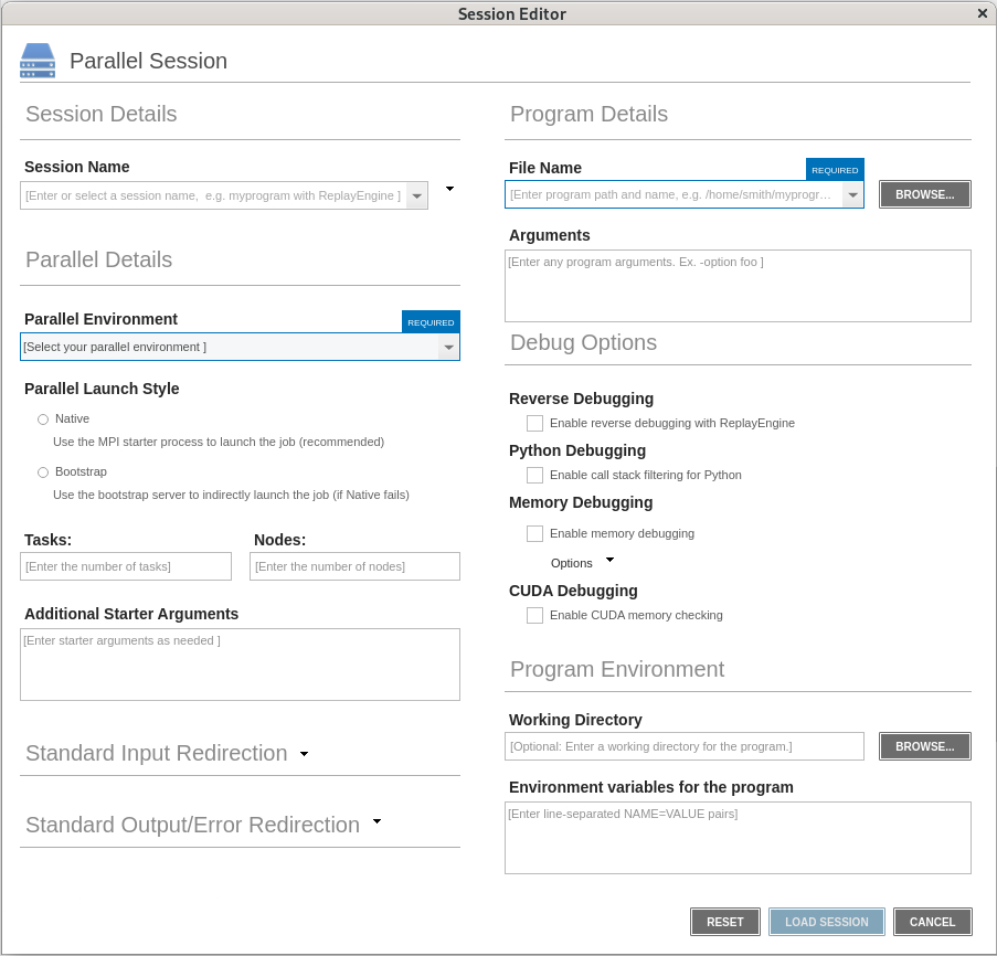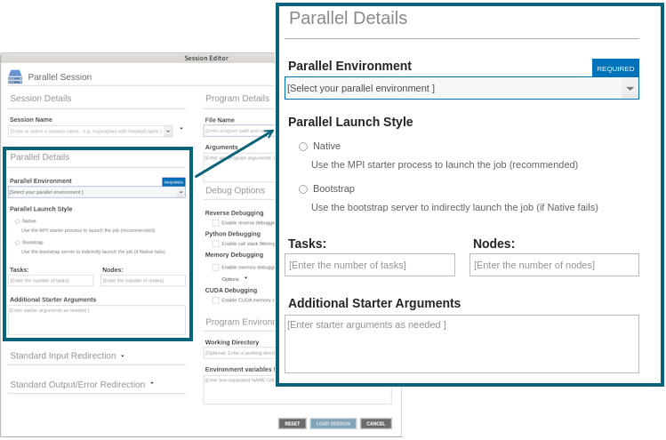Using the UI, in which case the starter program is not under TotalView control. In this scenario, enter program information into the Parallel Session Dialog from within the Session Editor.
