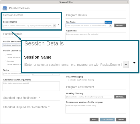 Any previously entered sessions of the same type are available from the Session Name dropdown box. Once selected, you can change any session properties and start your debug session. See Editing a Previous Session.