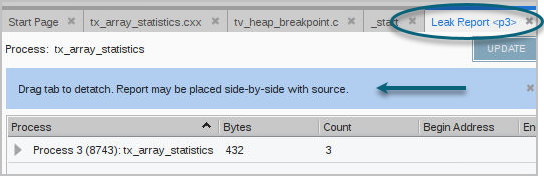 For the best viewing, detach the report and dock it beside any open source window to view the code and the report side-by-side, as suggested when it initially displays. This enables you to examine source level details as you explore the report’s leak data.