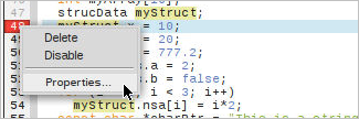In the Source view, right clicking on the breakpoint’s line number to bring up the context menu and selecting Properties.