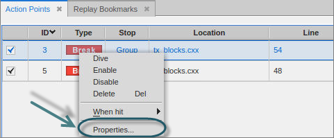 In the Action Points view, right-clicking on the breakpoint to bring up the context menu and selecting Properties.