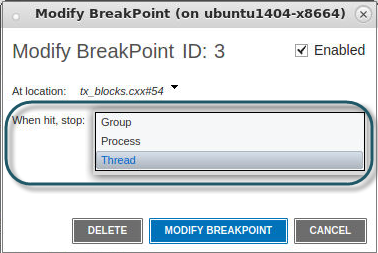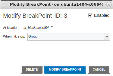 In this dialog, you can enable, disable or delete a breakpoint, view the breakpoint’s location using the At location drop-down, or adjust the breakpoint’s width under the When hit, stop drop-down.