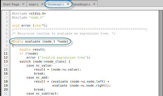 Note that since the evaluate() function is in a different file, evalexpr.c, that source file opens for viewing in addition to the source file already open containing the main() function.