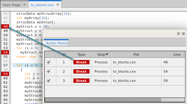 The breakpoint expression—pointing to line 45—is displayed in the Actions Points Location column as well as the location of the actual breakpoint at line 48. Retaining the original expression supports the situation in which a library that is dynamically loaded does have line number symbols at that location. As the program runs and dynamically loads code, TotalView reevaluates the breakpoint expressions, factoring in any new line number symbols it finds. If better-matching line number information is found, the address blocks in the breakpoint are updated to add the addresses of the new line number symbols, and possibly disable or invalidate old address blocks. This ensures that the breakpoint triggers for the most relevant source line.